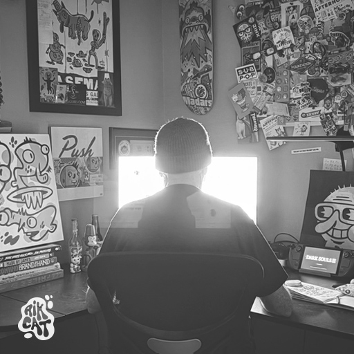 Rik Catlow (aka rikcat, b. 1970, Hoboken, New Jersey) is an Austin, Texas–based artist working in abstract mixed-media collage. His work blends the visual language of urban street art with a deep sense of nostalgia, drawing from mid-century illustration and design, vintage advertising, and classic cartoons from the 1930s through the 1950s.